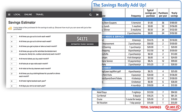 How Much Can I Save? Try our savings calculator and see how just a few pizzas, movies or purchases can add up!